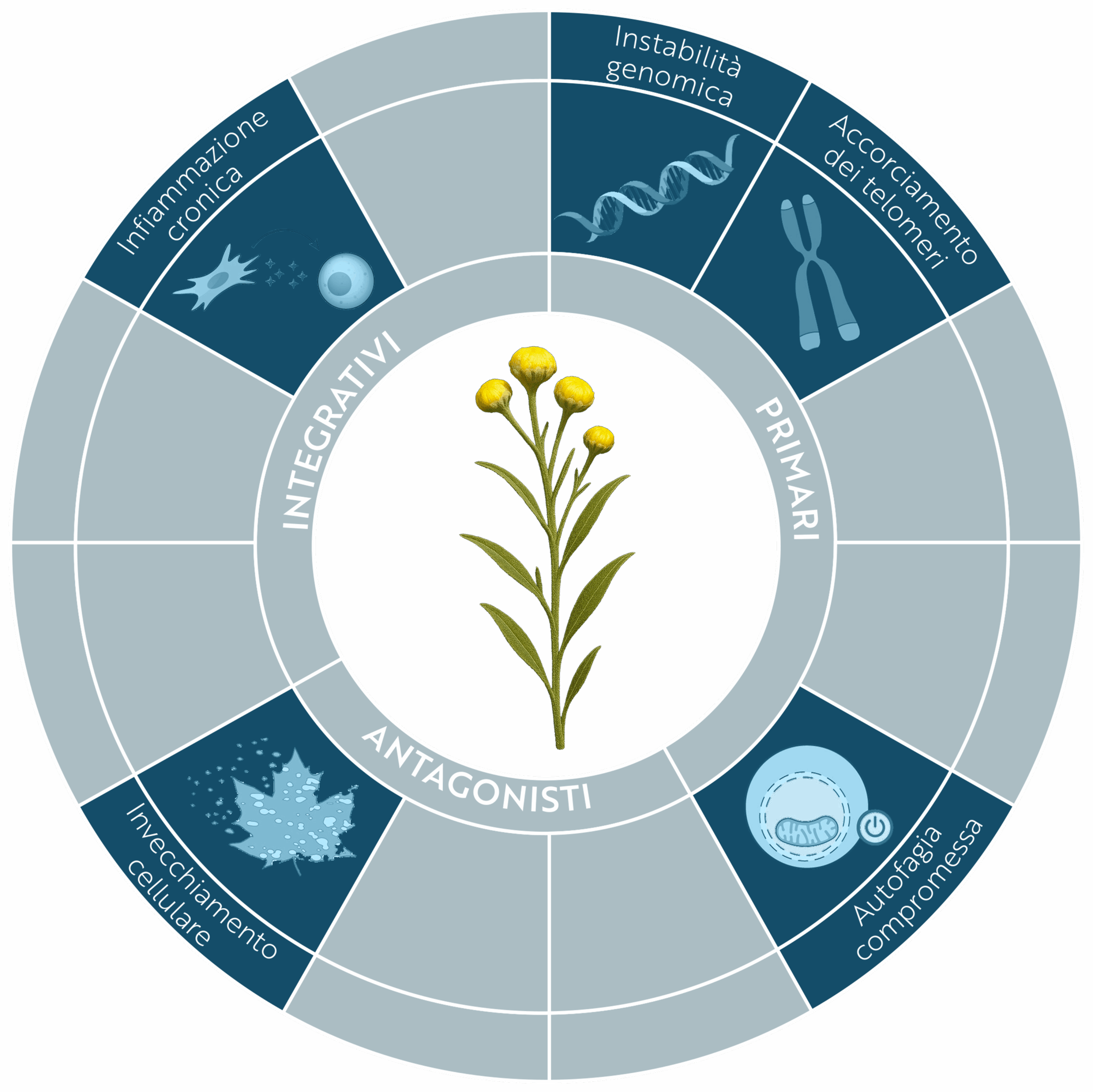 Elicriso – rigenera e supporta la barriera cutanea e il microcircolo, protegge le cellule grazie alle proprietà antiossidanti e antinfiammatorie.